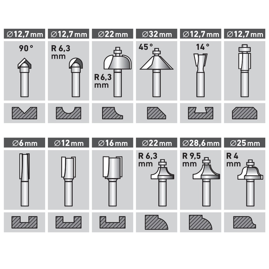 Felsőmaró készlet felső marófej szett 12db-os befogás 8mm fej 6-32mmFelsőmaró készlet felső marófej szett 12db-os befogás 8mm fej 6-32mm