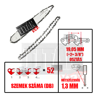 Láncfűrész láncvezető+2 lánc szett 52 szem 1,3mm 3/8”