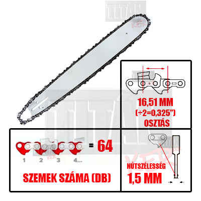 Láncfűrész láncvezető+lánc szett 64 szem 1,5mm 0,325” 40cm