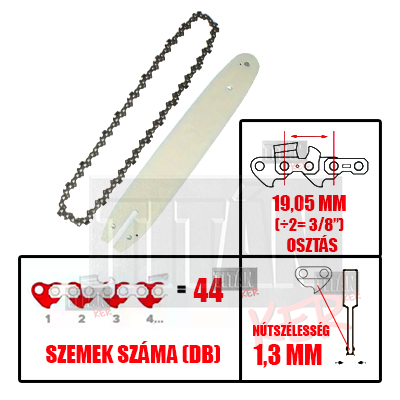 Láncvezető+lánc szett 44 szem 1,3 mm 3/8” ágvágóra láncvezető és lánc